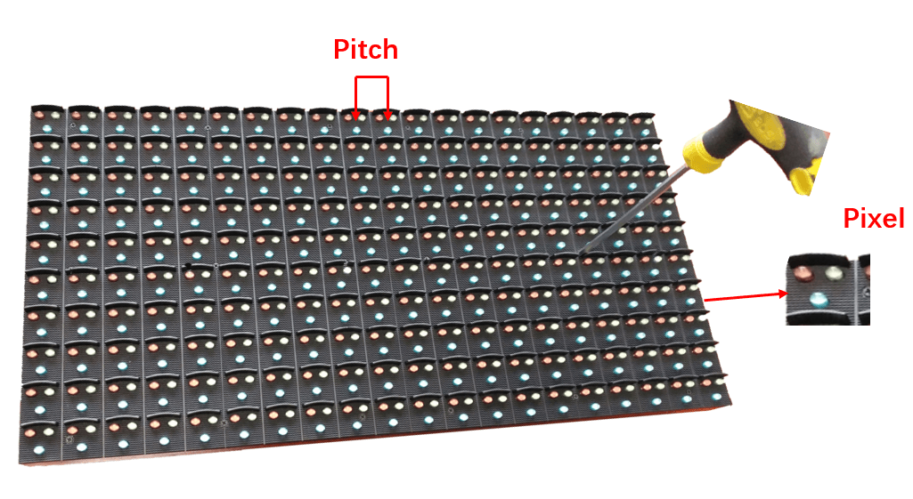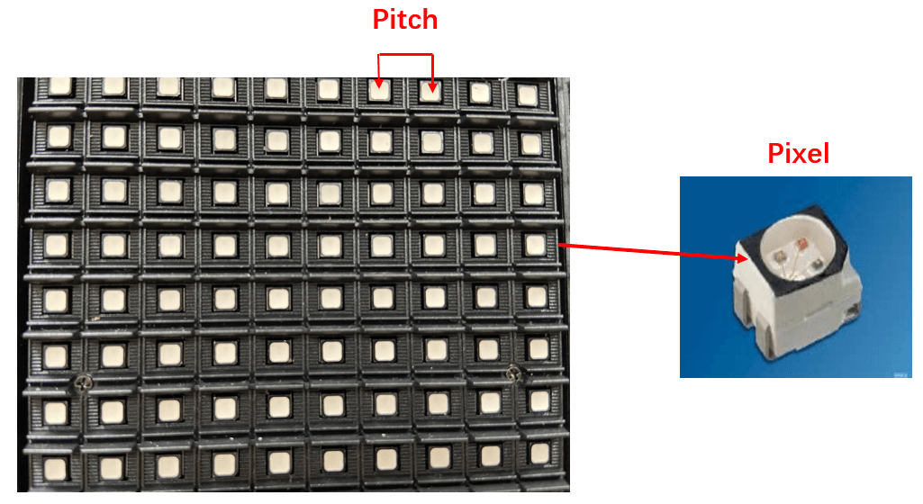 Піксель - гэта найменшы кластар святлодыёднага модуля або святлодыёднага відарыса экрана, кожны кластар складаецца з трохкаляровых святлодыёдаў, адзін чырвоны, адзін зялёны і адзін сіні, што азначае піксель